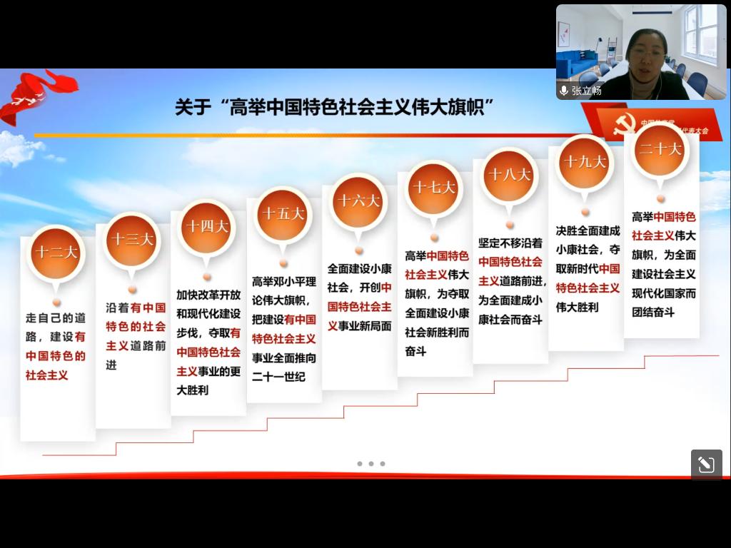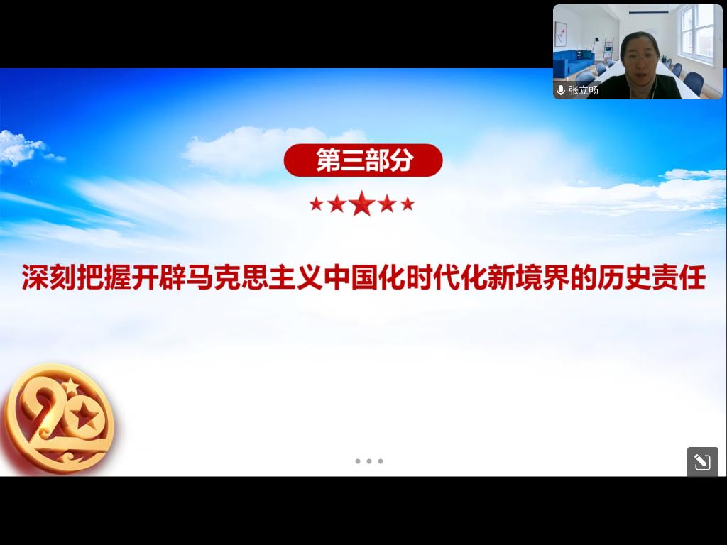 最后张院长指出要深刻把握开辟马克思主义中国化时代化新境界的历史责任,当下第二个百年奋斗目标的宏伟蓝图已经展开,作为国家的青年一代,更是要主动承担起实现这个伟大梦想的责任,把党的二十大精神贯彻到工作学习的各个方面之中,精进本领,践履所学,不辱时代使命,不负青春韶华,举步共进新征程!