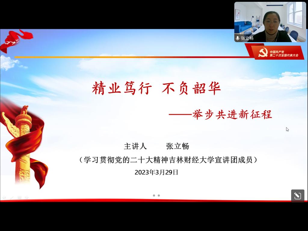 2023年3月29日晚,自拍偷拍 组织全体学生召开线上宣讲会,学习贯彻党的二十大精神,会议主题为“精业笃行 不负韶华——举步共进新征程”,主讲人为自拍偷拍 张立畅副院长。