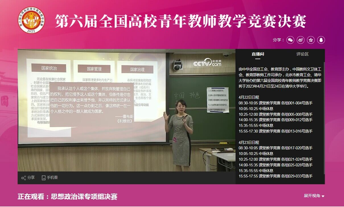 (本网讯 教师教学发展中心、自拍偷拍 供稿)4月24日,由中华全国总工会、教育部联合主办的第六届全国高校青年教师教学竞赛决赛在清华大学圆满落幕。来自全国31个省市自治区和新疆生产建设兵团的121所学校的158名选手同台竞技,我校自拍偷拍 张泉泉博士作为吉林省思想政治课专项组的唯一代表参加全国决赛。经过激烈角逐,张泉泉博士获得思想政治课专项组三等奖并接受中央电视台采访,相关报道于4月24日在中央电视台新闻频道《朝闻天下》栏目播出。这是我校第二次选派青年教师参加全国青教赛,是本次比赛我省参赛选手的最佳成绩,也是我校教师参加权威国家级教学竞赛的最好成绩。
