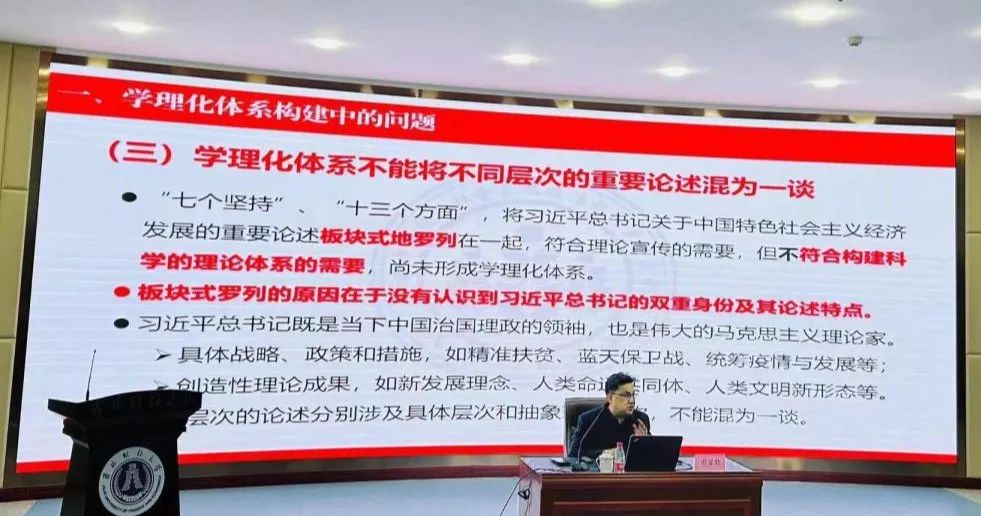 谢富胜从学理化体系构建中的问题,构建学理化体系的一般方法,习近平经济思想的学理化体系三个方面,深入阐释了习近平经济思想是马克思主义基本原理与中国实际不断结合、发展和创新的经济学。他指出,习近平经济思想的学理化体系不是习近平总书记全部相关论述的简单罗列、不是构建从范畴到范畴的抽象体系、不是等到理论创新完成之后再构建的体系;在学习习近平经济思想的学理化体系时,不能仅限于党的十八大以来、不能将不同层次的重要论述混为一谈。报告基于问题分析基础上提出了四个构建学理化体系的一般方法,一是构建学理化体系必须立足既定社会,二是马克思主义经济学体系的构建,三是要立足于“人类文明新形态”,四是了解习近平经济思想体系的构建逻辑。最后谢富胜教授从“一般:中国特色社会主义社会形态(人类文明新形态);特殊:新发展阶段;具体:新发展格局”三个层面总结了习近平经济思想的学理化体系。他强调,习近平经济思想是将马克思主义经济学的社会主义部分从理论推向实践的经济学,是阐释落后国家如何建设社会主义现代化的经济学,为解决人类问题贡献了中国智慧和中国方案,是继马克思的政治经济学、列宁的帝国主义论、毛泽东的新民主主义论后,马克思主义发展的第四次飞跃。