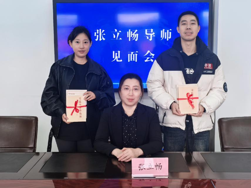 会上,张立畅老师将精心挑选的书籍和自己的著作送给两名新同学,鼓励他们广泛阅读,积累文献阅读量,从而实现从量变到质变。两名同学纷纷表示一定珍惜书籍,努力学习,不辜负老师的期望。