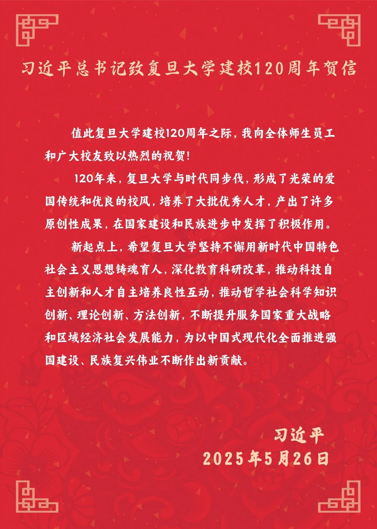 中共中央总书记、国家主席、中央军委主席习近平26日致信祝贺复旦大学建校120周年。信中指出,120年来,复旦大学与时代同步伐,形成了光荣的爱国传统和优良的校风,培养了大批优秀人才,产出了许多原创性成果,在国家建设和民族进步中发挥了积极作用。信中强调,新起点上,希望复旦大学坚持不懈用新时代中国特色社会主义思想铸魂育人,深化教育科研改革,推动科技自主创新和人才自主培养良性互动,推动哲学社会科学知识创新、理论创新、方法创新,不断提升服务国家重大战略和区域经济社会发展能力,为以中国式现代化全面推进强国建设、民族复兴伟业不断作出新贡献。