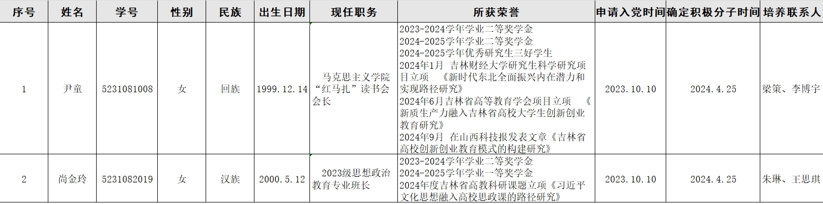 经党支部培养教育和考察,以上2名同志已基本具备党员条件,在听取党小组、培养联系人、党员和群众意见的基础上,经支部委员会2025年6月5日讨论同意并报上级党委备案,尹童同志、尚金玲同志于2025年6月5日被列为发展对象。