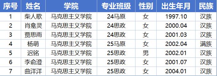 经党支部培养教育和考察,7名同志已基本具备入党积极分子条件,在听取班级同学、培养联系人、支部党员意见的基础上,经支部委员会2026年4月2日讨论同意并报上级党委备案,7名同志于2026年4月3日被列为入党积极分子。基本情况如下(按学号排序):