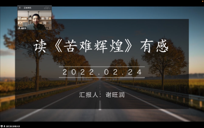 首先谢旺润同学分享了读书心得,在十分钟左右的汇报中,谢旺润同学根据书中内容,谈到“生命只有一次,生活非常美好,还有什么比生死考验更大的考验呢?但是毅然决然的选择容不得半点犹豫,一刹那的判断才是人性最真实的体现,最终信仰作出了决定。所以,苦难之中,更显信仰的力量。”。