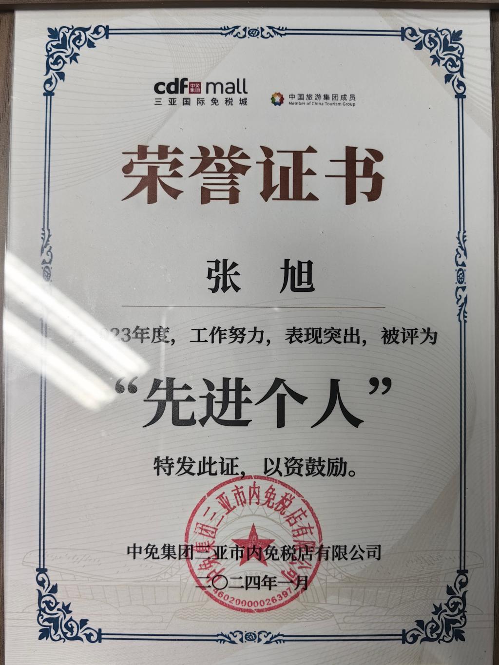 工作四年间,无论是在政府职能部门作办事员,还是在央企国企作行政人员,始终秉承积极向上、认真负责的工作态度。2023年度,因工作努力,表现突出,被评为中免集团三亚市内免税店有限公司“先进个人”荣誉称号。